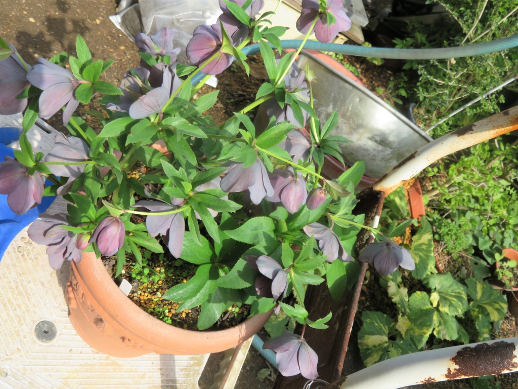 JUGEMテーマ:花のある暮らし JUGEMテーマ:園芸 春らしい一日でした。 昨日のように雨が降ると寒かったですが、 今日は大方暖房なしで過ごせました。 黄砂がすごい。一日どんより曇ってました。 明日のほうがひどいらしいです。 クリスマスローズ、を植え替えました。 グレーパープル シングル 二株に分けて、一つはスリット鉢に、一つは元の鉢に植え替えました。 土は赤玉、腐葉土、鹿沼、もみ殻燻炭、牡蠣殻で、 昔かった本に書いてあった配合です。 二つに分けるの...