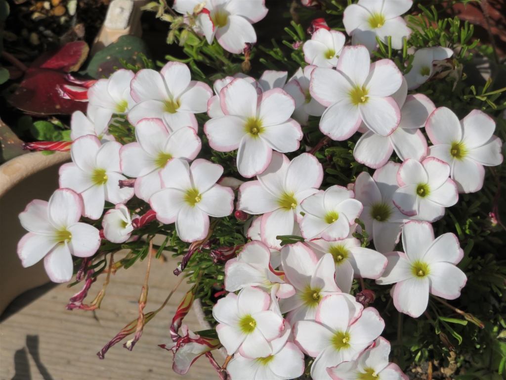 JUGEMテーマ:花のある暮らし JUGEMテーマ:園芸 今日から暖かくなるという予報どうり、 気温は高かったのですが、 風が強くて、寒く感じました。 午前中買い物に 午後オキザリスの鉢の草を引きました。 小さい草なので、ピンセットを使って。 夕方妹が甥の所に荷物を送るとかで、 縫ってある袋物渡しました。 伊予柑と、甘夏、水菜、ニンジンもらいました。 しっかりお百姓さんしています。 柑橘の枝落としたり忙しいみたいです。 今日の花 オキザ...