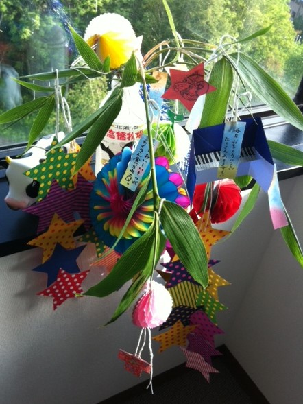 JUGEMテーマ:天体(月・星・他)〜残念ながら夜は曇り空日記〜七夕飾りを作って、クマザサに飾っています。さかパンのお気に入りの「でんぐり」増量なので、ちょっと重量感がありますよ。