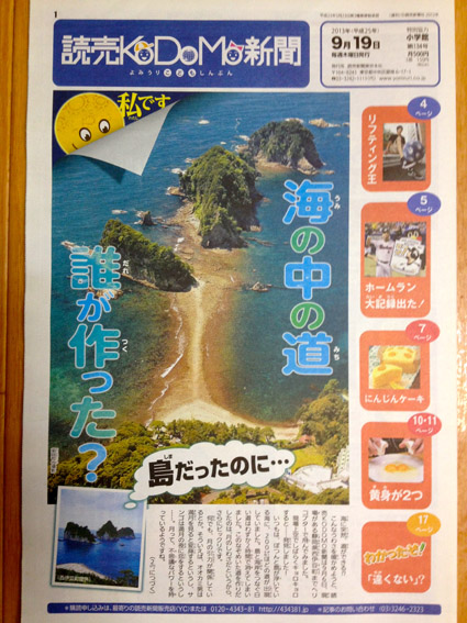 JUGEMテーマ:天体(月・星・他) 読売KODOMO新聞 第134号が2013年9月19日(木)に発行されました。 この海の中にある道は月の引力の関係で作り出されたとか。 読売KODOMO新聞のホームページはコチラ イラスト:ハマダミノル 今週の「わかったぞ!」は国語です。 言葉の活用について学習します。 わかったぞ!のホームページはコチラ イラストレーター ハマダミノルweb→http://minoru-h.com