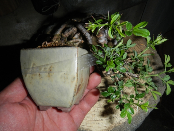 JUGEMテーマ:盆栽 おはようございます、モンカベです。 実生のクチナシです。 植え替えをして、一緒に針金で曲げてしまった しかも、テラコッタの、タコツボ自作鉢ですが、 素焼きしかしていないので物凄いスピードで乾きます。 ん〜〜〜 それではまた今度