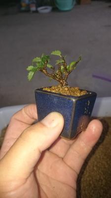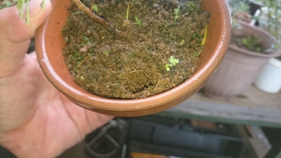 JUGEMテーマ:盆栽 おはようございます、モンカベです。 自己責任シリーズ第二弾! 春に挿し木をしていた、ニレケヤキです。 ジメジメのせいで、植え替える前の写真を撮り忘れてしまった すべて、ジメジメのせいです 許しません! ハイッ!植え替え後の写真です! 二本やっちまいました 7〜8?位は、根が伸びていました。 長い根は切り詰めて、細い根は残してあります。 あ〜〜〜 それではまた今度