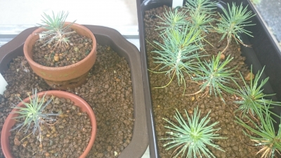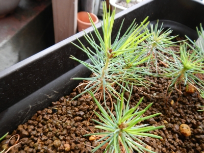 JUGEMテーマ:盆栽 おはようございます、モンカベです。 赤松の実生苗を見ていて気付きました。 今年の春に「軸切り挿し芽」をしたとき、 二本は小さい鉢へ、あとはプランターへ戻しました。 写真では判りにくいですが、定規で測ってみました。 プランターの物は約7?、鉢の物は4?チョット、 個体差もあるようですが、1.5倍は成長するようです。 フムフム 毎日見ているのに、今頃気付いたダメなモンカベでした それではまた今度