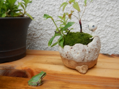 JUGEMテーマ:盆栽 おはようございます、モンカベです。 この暑さにカエルも盆栽の木陰で休んでいました 寒冷紗も設置して、 夏の準備完了! はい、今日のテーマはイソザンショウ 今朝の写真です。 枝が増えてほしいな〜 と思っていた、磯山椒 実は、いつだか忘れましたがビヨヨ〜〜ンと一本だけ伸びの良い 枝を切っておきました。 新芽が出ているな〜とは思っていましたが、 今朝よく見てみると・・・ 枝になりそう! たぶん枝!! 枝であってほしい!!! モンカベでした それではまた今度