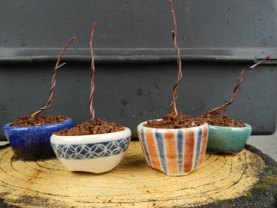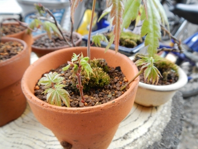 JUGEMテーマ:盆栽 おはようございます、モンカベです。 寒いです!これぞ、寒の戻り この雨で桜も散ってしまいそうです。 入学式まで桜が残っていてくれたらな〜と思っています。 それでは今日のテーマは、挿し木!! 挿し木と言って良いのか??? 前にモミジの苗を植え替えたときに、 小さくしたいことを理由に、先っちょ切ったモミジがありました。 その先っちょ、捨てるのがもったいなくて素焼き鉢に植えたモミジの横に 挿しておいたら、芽が出ていました。 コチラ三本です 初めての経験なので成功しているのか??...