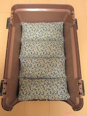JUGEMテーマ:ハンドメイド ダッくんのハウスに入れるクッションを リメイクしました。 ダッくん、お留守番のときは サークルの中でがんばってもらっています。 サークルは、90?×90?あるので ハウスを入れ トイレシートを敷いています。 今は、寒いので ハウスの中には ダウンのひざ掛けにカバーをかけて 折りたたんで入れてあります。 リメイクしたのは、春から使うようです。 ダッくんは、ブリーダー廃業レスキューで ...