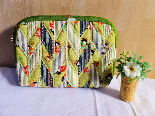 JUGEMテーマ:ハンドメイド 和の縞模様の布地を使ってポーチをつくってみました。 ☆グリーンの矢絣模様のパッチワークポーチ☆ グリーン系の縞模様と柄模様の布地をつかって 矢絣型にパッチワークしたポーチです。 ☆紺系の縞模様の和のポーチ☆ 紺系の和の縞模様の布と赤に麻の葉柄の布地を組み合わせてポーチをつくってみました。 キルトに工夫をしてみました。