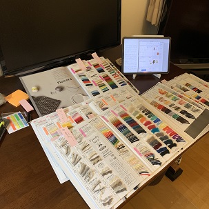 こんにちは。knit-c(ニットシィ)トヨヒデです。 来年2020年発売の「トヨヒデカンナのバッグと小物/アップルミンツ」 の製作過程です。 写真はデザイン画から糸見本を見ながら 配色などを振り分けているところです。 ・糸メーカーさんに偏りがないように、 ・糸のアイテムはできるだけ定番を選ぶ、 ・作る人の負担にならないように色の配分に気を付ける (ちょっとしか使わないのに1玉買うというロスはなるべく避ける) ・糸見本だけではわかりにくい糸はいくつか候補を挙げといて ...