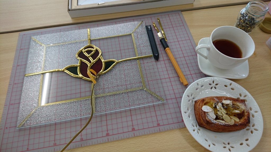 JUGEMテーマ:ハンドメイド フネでございます。こんばんは! 今日は楽しいグラスアートの日。 以前から作成していたインテリアの額が完成しました👏👏👏 レッスン中の楽しいひととき。 先生から紅茶とさつまいものデニッシュの差し入れです。いつもありがとうございます。 そして、こちらが完成作品。額に入れました。 大好きな薔薇の模様のまわりには、磨り硝子風のフィルムが貼ってあるところと、透明なところがあります。 ガラスの...