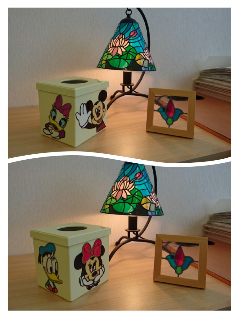 JUGEMテーマ:ハンドメイド フネでございます。おはようございます。 昨日は月に2回のグラスアートの日。 タラ子のために作っていたダストボックスが完成しました♪ 後ろにあるスタンドとフレームは先生の作品です。 前後左右からみたキャラクターのアップです。 やはりデイジーが難しく、睫毛や嘴のラインが綺麗に出ませんでした💦 グラスアートでキャラクターは初体験でしたが、思った以上に悪戦苦闘しました。 規定のデザインでなく、自分で考えるのは楽しい作業で...