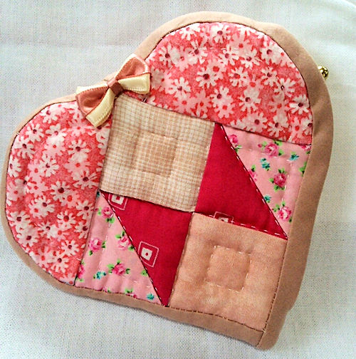 JUGEMテーマ:ハンドメイド 梅雨の晴れ間が見えた昨日、今日は早くも朝から曇り空でそろそろ雨が降りそうな雲行きになっております。 大きなこたつ掛けができあがったので一安心。 今度は小ぶりなポーチを作りたくなってきました。 ☆ハートのパッチワークポーチ☆ 12cm角ほどの大きさのハート型のポーチです。 小銭入れか、飴ちゃん入れ、薬入れになるかな〜っと。 形がハート型ということで、残念ながらカード入れには...
