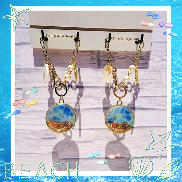 JUGEMテーマ:ハンドメイド こんにちは。母です。 今朝は少し寒かったのに、お昼にはすっかり暖かくなりましたね。 昨夜、作品の材料を何回も押し入れから出し入れしていたら 右腕手首の筋を痛めてしまいました…(+o+)どうしましょう…。 今日は天気も良かったので作品の写真を撮るチャンス!と、お庭で撮ってきました。 作ったばかりの作品をご紹介したいと思います! レジンで作った、浜辺のバッグチャームになります。 どうしても海のレ...