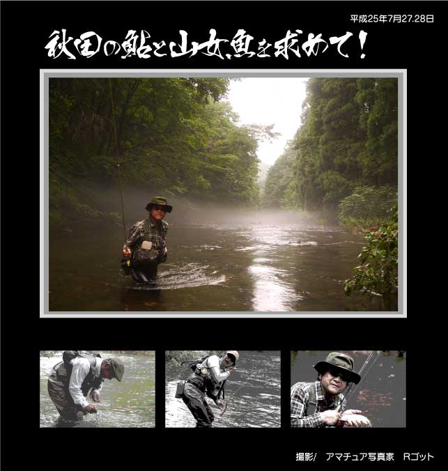 JUGEMテーマ:フライフィッシング JUGEMテーマ:フィッシング目立つステッカーの達人7月27.28日 福島県の看板屋、釣りきちアートマンが書く釣り日誌本日の漁場=秋田県 天気=曇り・大雨・曇り 風=無風 気温=ちょうど良い今日は『鮎と岩魚と山女魚の塩焼きでグイ〜ッと』という企画で大雨注意報の出ている中、3時間車を走らせ、やって来たのはこの川です。