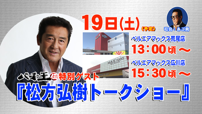 番組ゲストで松方弘樹さんが登場! 司会はあご勇さん! 収録は 9月19日(土) ベルエアマックス荒尾店に13:00頃〜 ベルエアマックス広川店に15:30頃〜 また当日は、ゆみちゃんが収録に登場! みなさん応援よろしくお願いします。 JUGEMテーマ:パチンコ パチスロ