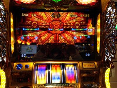 JUGEMテーマ:パチンコ パチスロ 本日のパチスロ実践はミリオンゴッド 神々の凱旋をメインとして書きます。 朝はパチスロアレジンから始まり(何故この機種かは聞かないで欲しい。初打ちであった)、ハイビスカスを見る為、ハナハナに行ったり、アラジンに行ったりと色々と打ち倒して時刻は15時頃、行き着いた先はミリオンゴッド 神々の凱旋である。 ミリオンゴッド 神々の凱旋に辿り着いたとき時、既に投資は2000枚位。 持ちメダルは500枚程である。 もー完璧にやられるモード全開の乱れ打ち状態になっていた。 何とか1/8...