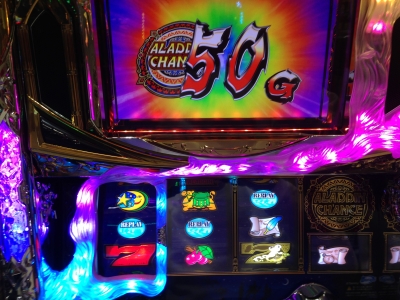 さて、スーパーアラジンチャンスが10ゲーム。 遊戯説明を見ると、スーパーアラジンチャンス中は1/10で単チェリーが出現すつとの事。 という事は、10ゲーム有るので、67%位で単チェリーが引けるのねとスーパーアラジンチャンスを消化します。 だが、チェリーを引くも、単チェリーでは無く、3連チェリーばかり。 3回程、3連チェリーを引くも単チェリーは一度も無く終了。 単チェリーが1/10では無く、連チェリーや単チェリー関係なく、トータルチェリー出現率が1/10になるのかな? 10ゲーム消化してスーパーアラジンチャンスは終了...