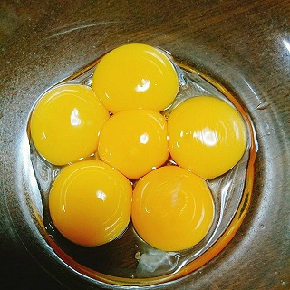 JUGEMテーマ:手作り 卵、ひとつ巨大なのがあった わってみたら二つ卵だった しかも卵黄ほかのと同じサイズだし 卵白五個なのに、卵黄六個 卵黄多いときは水分増やすんだよね。(多分・・・) そうしたら、水分半分ずついれればいいのに 一気にいれちゃったもんだから ほら〜〜ボールのまわりに粉まざってない証拠が・・・・ ...