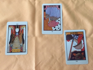 今日の一枚、の三枚バージョン。 メインは節制。 隠者 逆位置と死 逆位置。 ド派手!であります。 派手だけど静かな感じもします。 隠者と死神に見つめられる天使。 おごそかな誓いとともに、ゆっくりと変化が始まるようです。 今日そのものには、停滞感があったり 逆に必要以上にコミュニケーションが求められるかも知れません。 が、それらを糧として物事が進んでいくようです。 今までと違うやり方で、なにか新しい取り組みを混ぜあわせて 生み出していくようなタイミングです。 新月●に相応しいカードとなり...