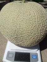 マルセイユメロンの方も今年一番大きく育ったのを収穫した。 普段使ってる2キロ用の量りでは振り切ってしまったので、ヘルスメーターでおおよそ量ってみると2.3キロほどだった。 ほんとうは水切りしてもう2、3日おいときたかったとこながら、昨日の雨で尻に僅かにひび入ってきており、一応離層も出てるので今日収穫した。 にほんブログ村 JUGEMテーマ:畑・ガーデニング