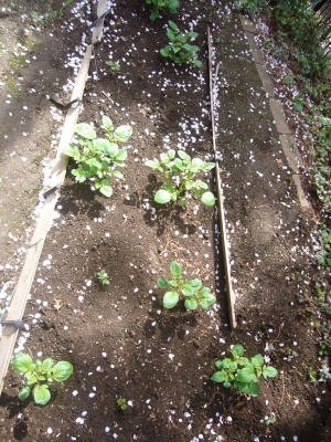 JUGEMテーマ:畑・ガーデニング ジャガイモ(インカのひとみ)が順調、順調。 (^◇^) 15個の種イモから14個発芽しています。 発芽したてのものもありますが、 ここのところ暖かくなって、 雨も降ったので大きく生長しました。 うれしいです(*´▽`*) では、では。 P.S. 庭の前の公園の山桜が散りはじめて いい感じで畑に降ってきます。 ♪さくら舞い散る中に忘れた記憶と 君の声が戻ってくる・・・・♪ ↑ケシメイツです。古いですか? ブログ村のランキングに参加しています。 ”ぽ...