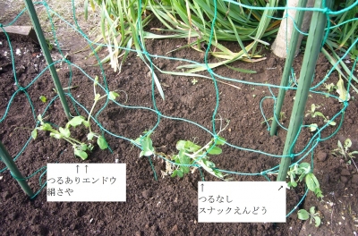 JUGEMテーマ:畑・ガーデニング こんばんは、3連休も終わろうとしています。 この3連休は畑の野菜達にとっては、雨も降ったし、 気温も少し上昇したので、まずまずだったかな? さて、本日はえんどうを植え付けました。 以前このブログで紹介した11月1日に種まいた スナックえんどうです。やっと植え付けました。 ついでにホームセンターで購入した98円の絹さやも。 支柱にネットを張るのに手こずっちゃいましたが何とか。 マメ科は空気中のチッソ分を吸収するので肥料は少な目で。 (ブログに書いたから...