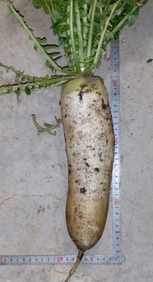 JUGEMテーマ:畑・ガーデニング 今週も大根を収穫しました。 1本/週で、3週目です。 収穫前↑。 長さ30?ちょい。先週より少し長い。 あらためて種の袋の説明書きを読むと 「根長38?、根径8?程度で曲がりも少ない」とのこと。 まずまずですな。(^-^) では、では。 P.S. 昨日、横浜中華街に行って 食べ放題、飲み放題で暴飲暴食してきました。 昨日植え付けた葉にんにく料理の食レポのことなど すっかり忘れてじゃんじゃか注文して ガッツリ食べて、明るいうちから酔っ払いました。 ...