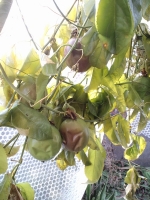 いかにも地球寒冷化の一端を思わせるような週末の猛烈な冷え込み、最低気温氷点下5度前後が3日も続いて、本来熱帯性のパッションフルーツにとってさすがにビニル1枚雑に被せた程度の防寒では持ちこたえることできず、ほぼ全ての果実が凍ててしまった(^。^;;それでも切ってみると、外皮はまだ全然青くっても中はオレンジ色になってるのがほとんどで、めちゃ酸っぱいものの、この様子だとしばらく部屋中で追熟すれば食べれそうな感じ。とりあえず比較的マシそうなのを残して半分ほど収穫してしまうことにした。そんでもって10個ほどはご...