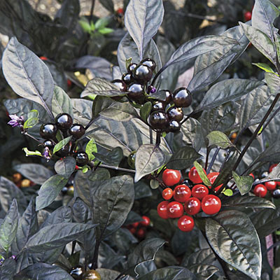 JUGEMテーマ:畑・ガーデニング リンク: http://www.marcheaozora.com/?pid=99095972 ブラックパールの葉色は若葉の段階ではグリーンです。 成長とともに、また温度が上がって日にあたると、光沢のある黒色に変化します。 艶がある黒色の実は辛く、成熟すると丸みを帯びたままダークレッドへ変わり、その後いくぶん楕円形になります。 株は地際部の側枝、側葉ともに旺盛で、枝は上方へ形よく伸びていく品種です。 生ブラックパールの育の強さとユニークな葉色は、寄せ植え用の植材として人気があります。 また、ブラッ...