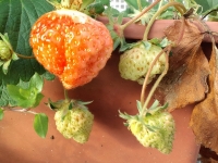 この冬は比較的暖かい日も少なくなかっただけに、軒下や塀際等で育ってるイチゴは花咲いたり着果したりしてるのもちょくちょくあった中で、とくにこの鉢の分は年末から少し色づきかけてたもんで、年明けてから簡易ビニルハウスに入れておいた。 ←今現在 ←1/4に屋外からビニルハウスに移した時形が歪なのは、虫も少なくって受粉が完全でないということだろう。虫と言えばこないだのカマキリさん。年明けて正月頃にはまだ元気でいてくれた♪その後、この二三日は姿見かけてないけど、どこかちょっとでも暖かいとこでそっと身をひそめて...