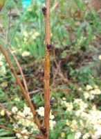 ”桃栗3年・・・”、とはよく言ったもので、食べ種蒔いて去年の春に発芽した桃、現在3本が育ってるけどどれもが、3年前に苗買って植えつけたのとほとんど変わらないぐらいの大きさに育っており、その内の1本はすでに翌年の花芽をいっぱい付けてくれてる♪ 右側拡大写真見てもらってわかるように、通常一か所から3つの芽が出ることが多く、この写真の場合は外側二つが花芽で、間に挟まれた平べったいのが葉芽。品種ははっきりとは覚えてないけど、蟠桃か黄金桃かのどっちかだったと思う。もちろん親と全く同じのができるとは限らないもの...