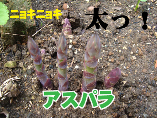 JUGEMテーマ:畑・ガーデニング 何だか 寒いのか温かいのか・・・でも今日はいい天気つい何日か前にニョキニョキと立派なアスパラが顔を出した!それも 極太この生えた場所というのも レンガの真横。植えた訳でもないのに3年前位に生えたのだ!!種がとんできたんだね〜そして今年はこんな立派になって・・・忘れていたので、全く手入れもしていないのに〜・・・ありがとう アスパラさんもっと伸びたらおいしく食べさせてもらうね♪そんで・・・また毎年勝手にでてくる三つ葉てんこ盛りです!!これは種をまきました!!かわ...