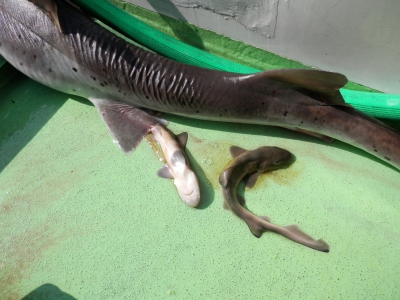 真ゴチ釣りの外道で釣れちゃった 【 ホシザメ 】 残念な事に 釣り上げた途端に船上で ”出産!”。。。ごめんなさい 同じ鮫の仲間でも 生まれ方色々 鮫の繁殖法は 卵生と言い卵で産む種類と 胎生という「ヘソの緒」を通じて体内でしっかり成長してから 生まれるものと あと〜卵胎生という 卵で産むのではなく 孵化してから子供の形で産み落とされる3パターンがいて 今回釣り上げちゃったホシザメはこの出産法で誕生! 鮫というと 映画「ジョーズ」の凶暴なイメージが強いが このホシザメは〜泥の中に棲んでい...