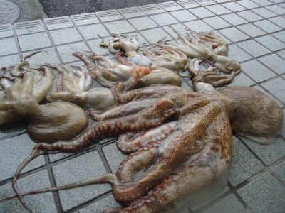 真ダコ大漁につき〜海酔タコ祭り! 本日のおすすめ品 【真ダコセット¥1200】 サット茹でタコの刺身(胡麻油塩でどぅぞ) シッカリ茹でタコの刺身 (岩塩orワサビでどぅぞ) 茹でタコと胡瓜の三杯酢 タコのカラッと唐揚げ 9匹中1匹は ご覧の様に 巨大タコ!≪just3kg!≫ 釣り上げた真ダコは 直ぐさまヌメリを取り 沸騰したたっぷりの湯にドボン! 足の方からそっと入れて 茹でました JUGEMテーマ:磯釣り