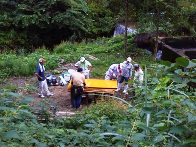 2014年8月31日(日) 昨年の春に、中村養魚場さんのサクラマスの蓄養池の修理をしましたが、今回は 蓋を新しく作りかえることにしました。 (写真は岐阜の高橋政己さんにいただきました) 今回も大工さんの良ちゃんと義くんが大活躍でした!! 今回のふたは分解して収納もできます!! 細かい作業に良ちゃんの腕が冴えます!! みなさん、おつかれさまでした〜。 ええのができたな〜。