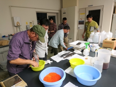 この季節、サクラマスのF0とF1の 人工授精も大忙しで、連日のように 行われています。 こちらの都合ではなく、魚たちに 合わせてタイミングよく!素早く! 福井県内水面総合センターにて。 この日は仲間も手伝ってくれました。 死んでしまった卵ゼロという好成績でした!!