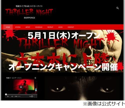 引用:ナリナリドットコム専門の語り手によって、45分に1度、本格怪談ライブが楽しめるエンターテイメントバー「怪談ライブBar スリラーナイト」が5月1日、東京・六本木(ロアビルB1F)にオープンします。同店は2011年に札幌・すすきのにオープン。今回は東京進出1号店だそう。(続きは上記リンク先をクリック)▶行ってみたい、できれば実話怪談を希望。やだなぁ〜…こわいなぁ〜…。