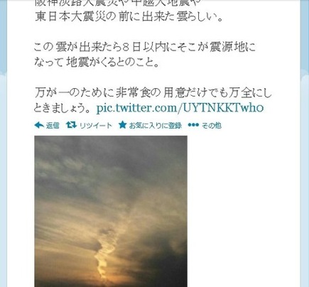 引用:ぱる速報地震の予兆を伝えるとされる「地震雲」なのですが、大変興味深い情報が得られました。どうやらツイッター上では「地震雲」は割と頻繁に 目撃されており、その頻度は少なくとも毎日1回以上は観測されているのです。つまり、大きな地震が起きる前に目撃されているのではなく、 実は普段毎日地震雲は目撃さ れているのです。ということは、いつどこで地震が起きようとも地震雲が毎日発生しているので、巨大地震ト紐づけ出来てしまう訳です。詳細はリンク先をどうぞ。▶うん、知ってた。地震雲のように予知や予言系の...