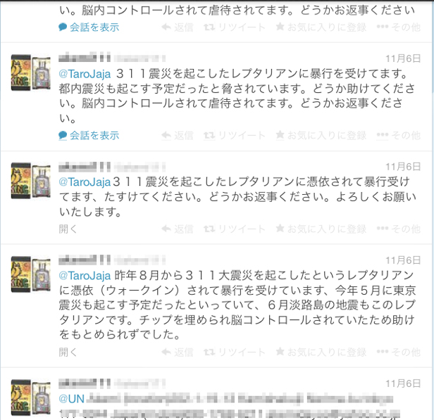 先週くらいから『私は爬虫類人に憑依された!』などとTwitterで騒いでいる女性がいると、匿名希望の方から情報をいただきました。実際に見てみますと、助けを求めるツイート先は、安倍総理やオバマ大統領、NASAまで…。この女性の必死さが伝わってきます。果たして、これは単なる嫌がらせなのか?それともガチなのか?皆さんと一緒に見て考えてみましょう。