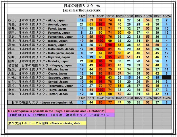 引用:オカルトまとめ様(いつもお世話になっております)当ブログと相互リンクしていただいている「オカルトまとめ様」から、衝撃のニュースを入手しました!海外の地震予測サイト『Quake Prediction』が各国の地震予測データを公開しているのですが、10月31日の数値がまじでヤバいそうです。詳細はリンク先をどうぞ。▶上記画像をご覧ください。福島、茨城、長野(松本市)、東京の4つの地域が、なんと100%!!100%ってすごいねwww明日は必ず地震が起こるということですねwww先日の記事でも述べましたが、オカルト的には「黒...