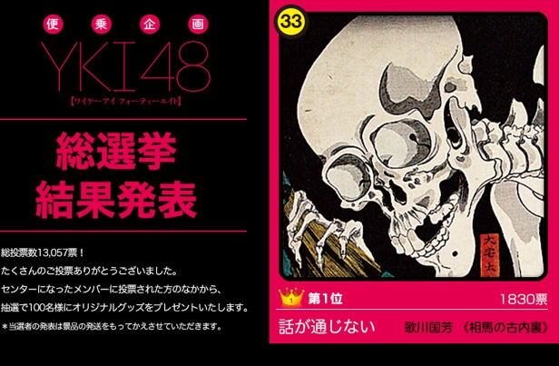 出典:YKI48総選挙結果発表 横浜駅東口のそごう横浜店のそごう美術館で「福岡市博物館所蔵 幽霊・妖怪画大全集」が7/27(土)〜9/1(日)の期間に開催されていました。そして、大きな話題となっていた「YKI(ようかい)48」の総選挙結果発表がなされました!!総投票数13,057票を得て、横浜のセンターに選ばれたのは、前回の大阪に続き2冠達成の歌川国芳作「相馬の古内裏」でした。他の各順位一覧はリンク先をどうぞ。▶これ名作ですよね。管理人も大好きです。「 私のことは嫌いでも、YKIのことは嫌いに(ry 」