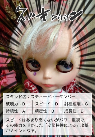 JUGEMテーマ:Blythe 久しぶりにズキューンカメラで遊んでみました☆ ブライスちゃんだと可愛いから、 臨場感が無くって残念。 オレスパ姉貴☆ なかなかの迫力ですo(^_^)o☆ 不思議そうなプリキョウさん☆ ジョジョの奇妙な冒険を知らない人にはちっとも楽しくない おたくネタ失礼しました。 1度やって見たかったにです☆ にほんブログ村