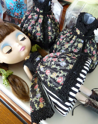 JUGEMテーマ:Blytheみなさま ドールショウまで あと1週間!! もない。。現在の製作現場です。ブライスの衣装が仕上がってまいりました!!(≧∇≦)もったりとした黒と、透け感のあるジョーゼット♪とても可愛らしいです(*^-^*)(販売品保管箱に衣装ごと収まるベル)ジョーゼット、手間が掛かりますね〜。モノトーンストライプのドレスに、ジョーゼットドレスを重ね着させるためにドレスの重なり具合をチェックしながらの手縫い。あと1週間もないのに、先は長い(^_^;)ドレスの装飾と、チュチュと、髪飾りも仕上げる予定なので...