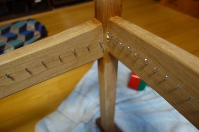 JUGEMテーマ:木工 座面を紐で編んで仕上げるのは初めての挑戦です。 色々な編み方があるようですが、今回採用したのは縦・横の均一で シンプルなタイプ。使用して紐(ペ-パ-コ-ド)は4ミリ径です。 準備として、座面の梁の内側にはL形の釘を正確なピッチで打ちます。 (これが結構面倒) 最初に短辺方向に24ミリ間隔で二本ずつ渡して張ります。 次は長辺方向にで、先に張った横糸を順にくぐらせて張ります。 この作業、紐がゆがまずきっちり揃うよう、弛みも出ないよ...