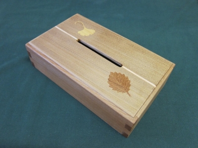 JUGEMテーマ:木工 本年最後の作品紹介は、木の葉を象嵌したティッシュ箱です。 最近は「箱なしティッシュ」が増えて来ているようですが、ビニ−ル 袋に入れたティッシュはテーブル上ではやはりだらしないもの。 そこで、是非おすすめしたいのがてづくりの木のティッシュ箱。 桜材とアガチス材で組んだ箱に、二枚の木の葉を象嵌しました。 象嵌は、糸のこを使った傾斜切りの落とし込みです。 イチョウの板を使うと黄色いイチョウの落ち葉の色そのものに なるのも面白いです。 ...