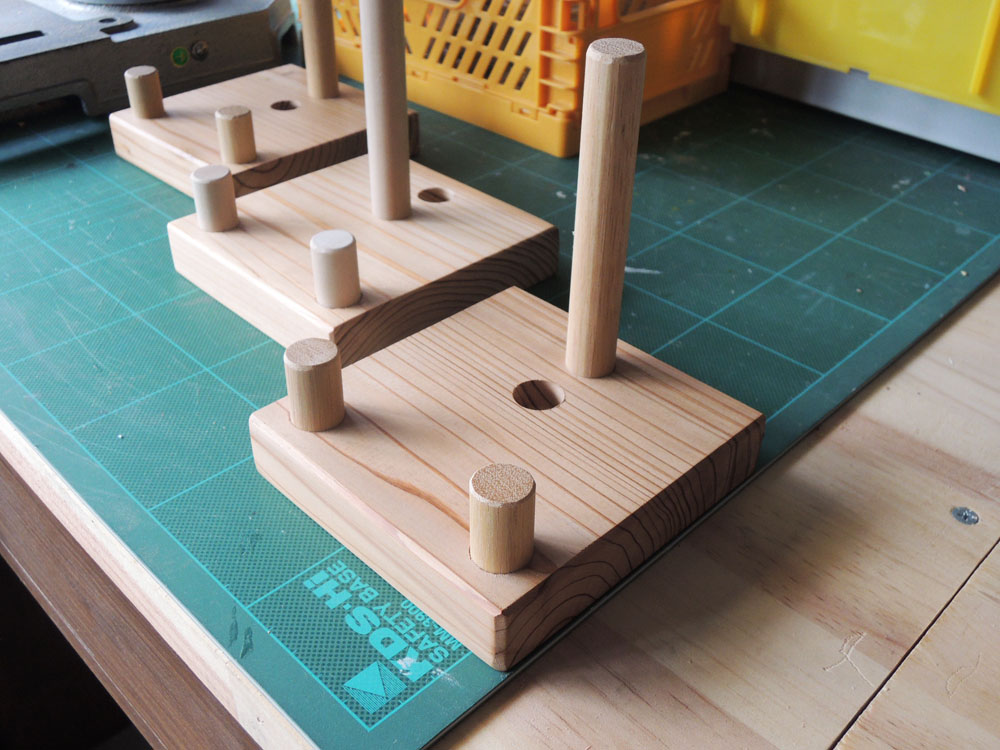 JUGEMテーマ:木工 工場第1弾のハガキサイズ用のガク、厚さが3cmあり、そのまま立てて飾ってくれてる人も多いみたいです。 それでもいいと思いますが、より安定感を出せるように台を作って見ました。 木目が面白いところを使って、作りはシンプルに・・・ 飾るものの厚さで、支えの棒を奥か手前かに調整します。 直径15mmの棒がゆる過ぎず絶妙にいい固さでハマりましたよ。 絵はだいぶ前に版画体験をさせてもらった時に描いたデザインです。なんか懐かしい。