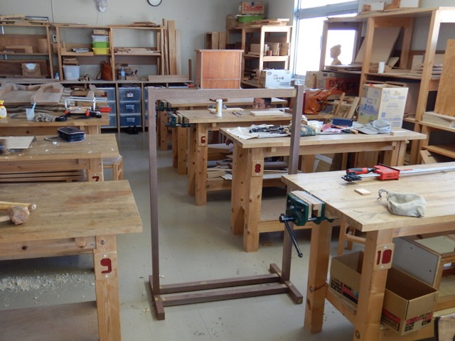 寺家木工舎でのハンガー掛け作り、残りは各ホゾへのくさびの差し込みと蜜蝋仕上げ塗装だけとなりました。まるで公園の鉄棒のようなそっけない作りとなってしまい、せめてもの反撃がホゾに差し込む白いハードメープルのくさびです。ホゾにの鋸で引いた溝にくさびを入れて、ホゾの凸部を台形状に削って、荏胡麻油を塗布すると、ウオルナットの焦げ茶の中にハードメープルの白がくっきりと浮かび上がりました。このワンポイント、なかなかおしゃれです