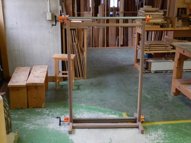 JUGEMテーマ:木工 ハンガー掛け作り、場所は木遊びから寺家木工舎に移動しました。今日はボンドを使って組み立てを行います。梅雨期のためか文箱作りで中断している間に、130cm長の角棒に数ミリの反りが発生しました。仮組みの時はクランプで挟むとホゾ穴にホゾが無理無くスムーズに入ったのですが、今日はクランプを締めていくと、ホゾがキュッ、キュッと音を発しながら断続的に入っていきます。組み立て終えて柱の角棒の直線性を確認するとほんの僅か内側に凹んでいます。そこで二本のクランプの締める位置を調整し、各接合部...