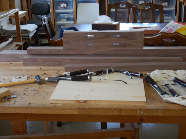 木工舎に再入会して、今日は2回目の予約日です。前回(初回)は、木遊びで作り始めていた「文箱欅版その2」の仕掛品を木工舎に運び、さっそく板材の面だしを始めたのですが、砥石を持ってくるのを忘れ、カンナが切れなくなったところで作業は続けられなくなりました。今回はその轍は踏むまいとしっかり砥石道具を持参。板の反りと逆目に注意しながらカンナをかけ、切れなくなったら刃を研ぎ直して、側板用板材をキズ無しの6mm厚に仕上げました。続いて、面出しした板材を文箱側板のサイズに裁断しようとしたら、今度は図面を自宅に忘れて...
