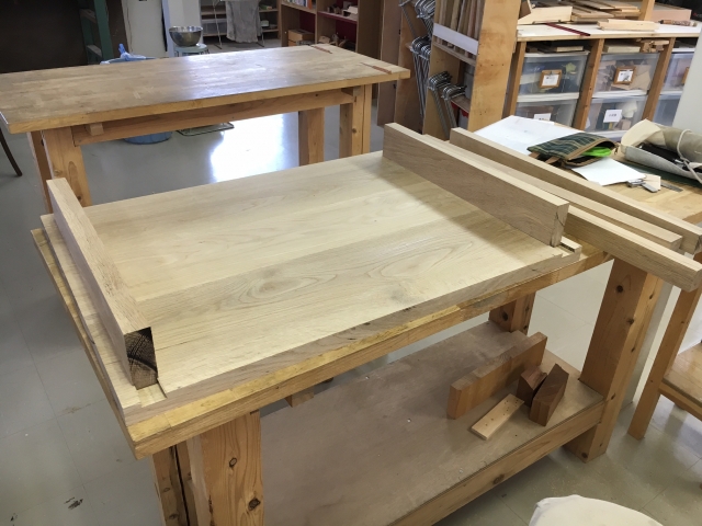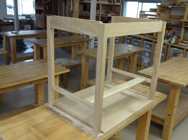 JUGEMテーマ:木工 横浜木遊びでのミニ机の製作は、天板と蟻桟(ありさん)の加工を終えて、脚部に入りました。部材は足4本、幕板1枚、貫2本、貫を繋ぐトンボ板、それに先週作った蟻桟2本。ホゾとホゾ穴で組み上げていきます。ここでまた一失敗。写真をよく見ると手前の貫にホゾ穴らしき溝が見えます。これ、貫にトンボ板用のホゾ穴を開ける時、間違って表側に開けてしまったものです。この失敗、実は昨年作ったほぼ同じ形の脇机でも全く同じところでやらかしています。一年前の失敗を無意識のうちに再現してしまう記憶力の良さ。こ...