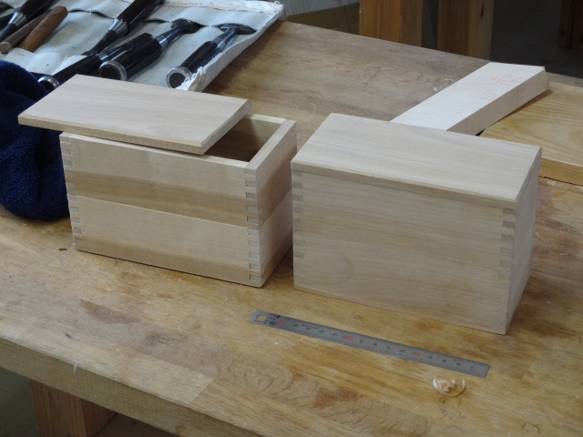 JUGEMテーマ:木工 千葉の実家を9時に出発して、日吉を通り、10時半に横浜木遊びに到着。茹だるような暑さの中、早速拭き漆講習の際に木地として使う弁当箱の製作に着手しました。使う木材はミニ机の引き出し作りで余った蒲ザクラです。木製の弁当箱は曲げわっぱ以外見たことがないので、特段形にこだわりがありません。暫定目標として500gくらい入る二段の縦長御重のような弁当箱を作ろうと思います。今回新しいチャレンジは側板の5ミリ幅のアラレ組の継ぎ。これだけ細かいアラレ組は初めてです。講習会まであと10日。今日のトラ...